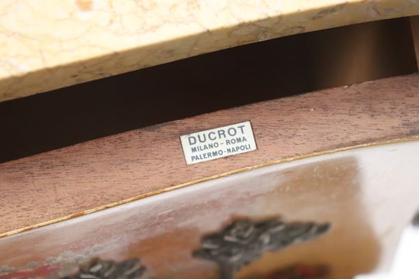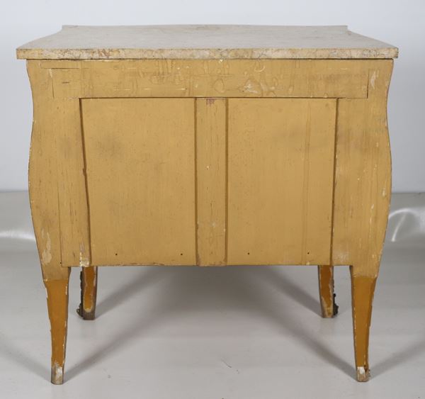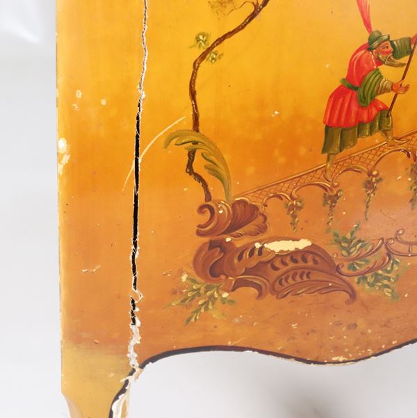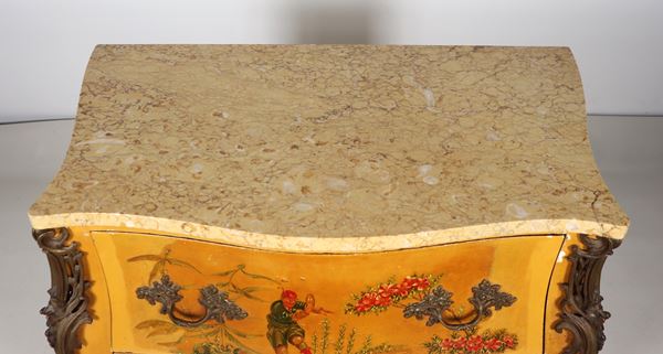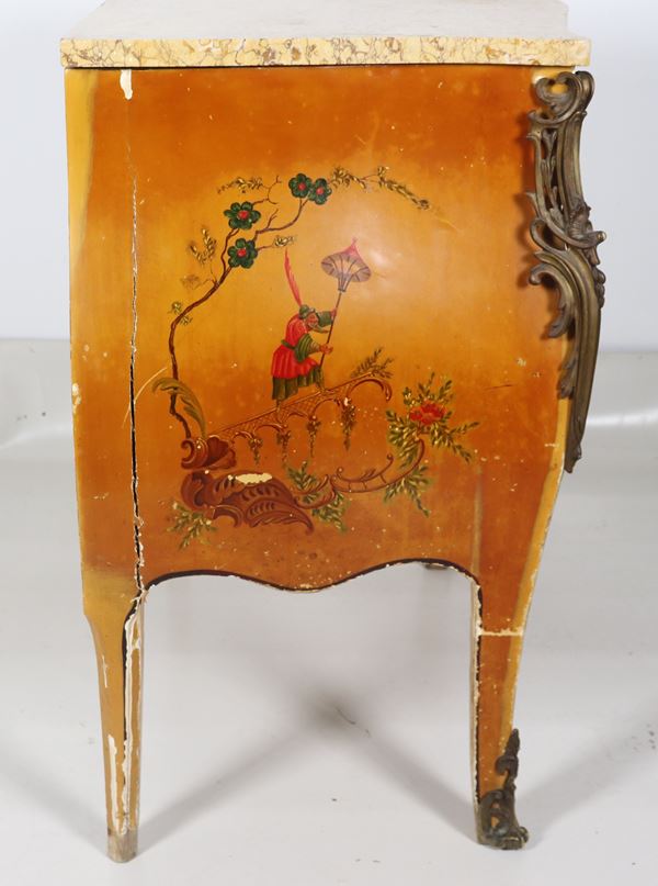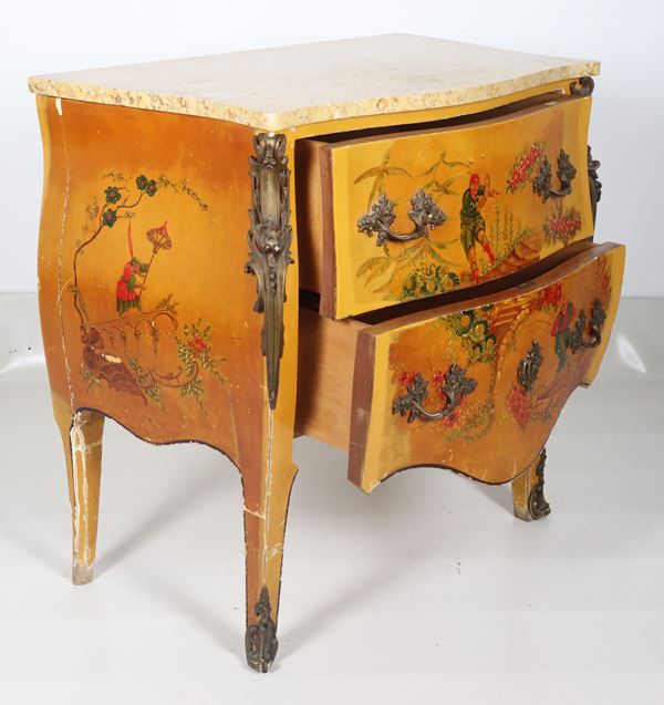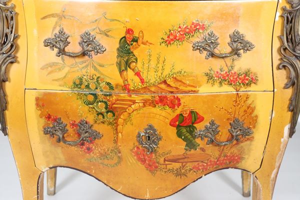 Comò a forma bombata in legno laccato e dipinto a motivi di cineserie firmato Ducrot