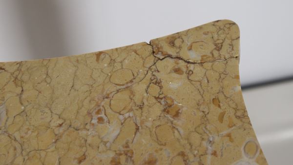 piano in marmo, due tiretti, guarnizioni in bronzo e quattro gambe ricurve, cm 84 47 x 83 h.