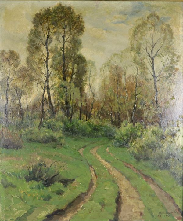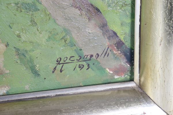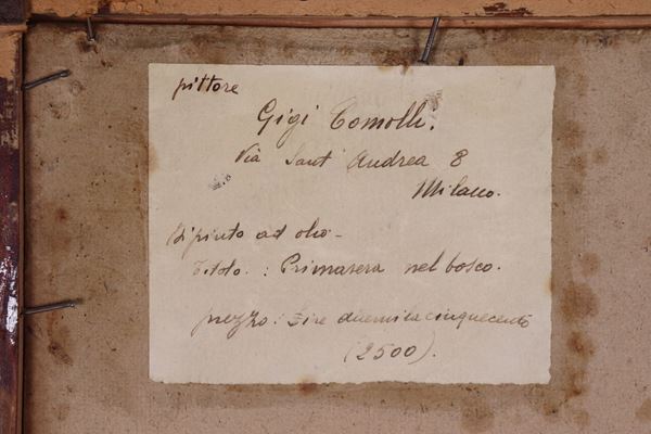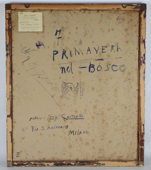 dipinto ad olio su cartone pressatocornice in legno dorato, cm 70 x 59.