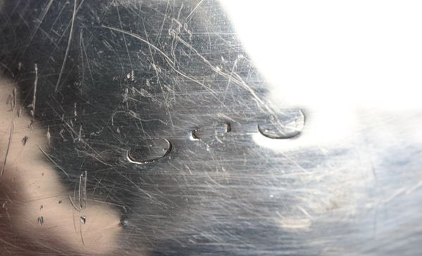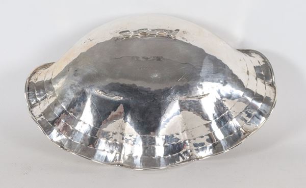 Conchiglia in argento martellato, con applicazione di pietra rossa gr. 345
