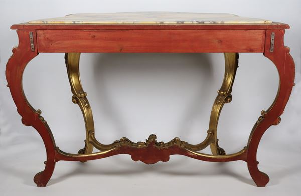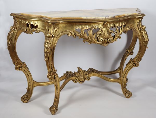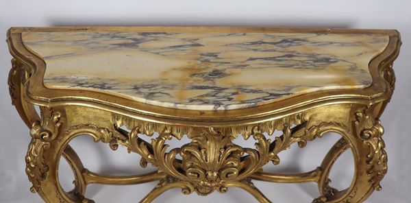 Consolle in legno dorato e intagliato a motivi Luigi XV, piano in marmo giallo antico