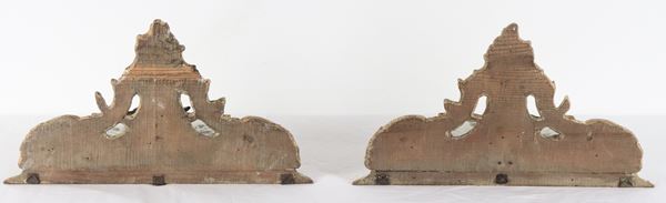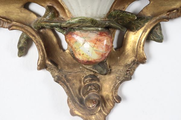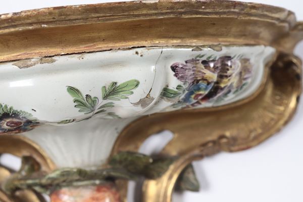 Coppia di antiche piccole mensole porta porcellane in maiolica policroma e legno dorato e intagliato