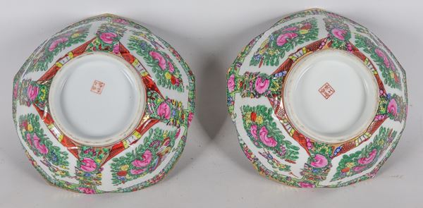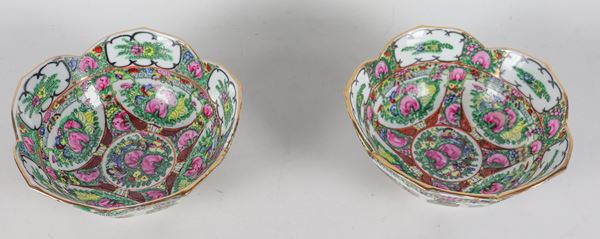 Coppia di ciotole cinesi in porcellana policroma di Canton con decori floreali