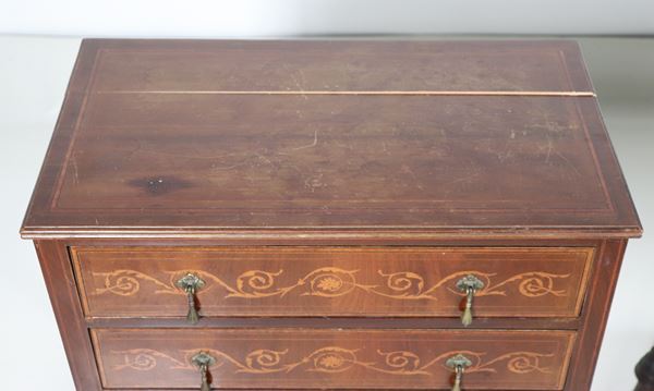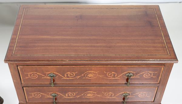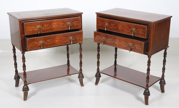 Coppia di comodini in noce con intarsi in bosso a volute floreali
