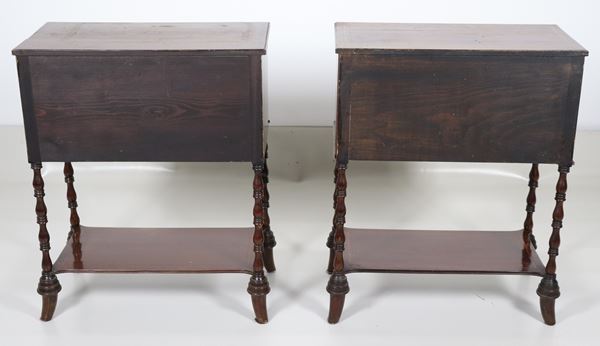 due tiretti e quattro gambe tornite riunite da pianetto sottostante. Un comodino presenta difetto al piano, cm 59 x 35 x 70 h ciascuno.