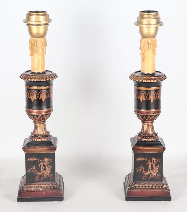 con decorazioni dorate a motivi di palmette e cineserie. Una luce ciascuna, cm 9,5 x 9,5 x 38,5 h.
