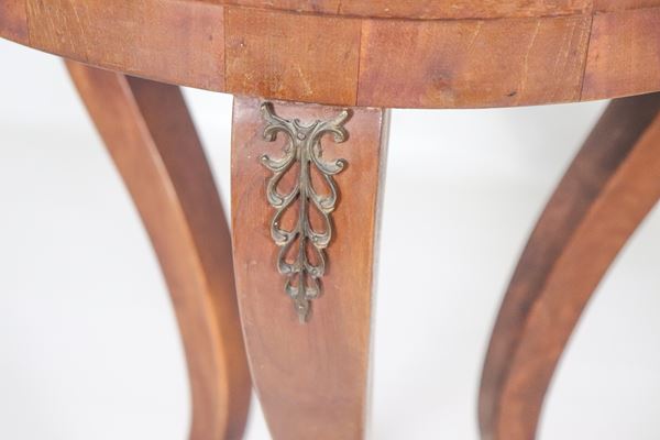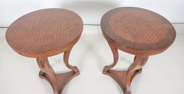 Coppia di tavolini toscani di linea Impero in noce, con piani intarsiati a marchetterie