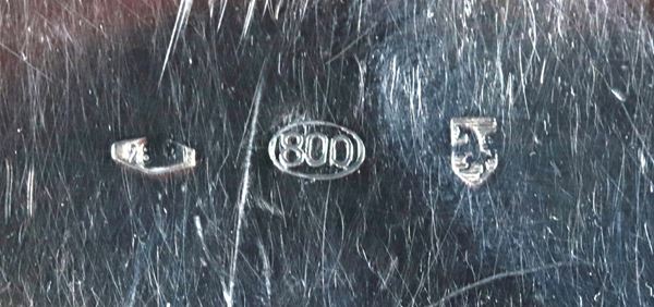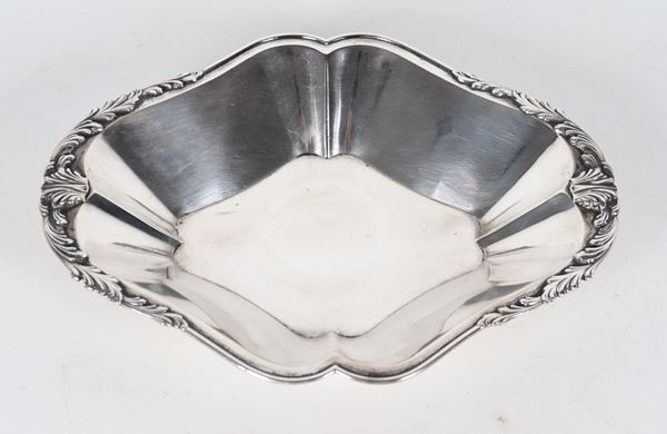 Fruttiera in argento a forma ovale centinata, sul bordo foglie d'acanto sbalzate, gr. 450