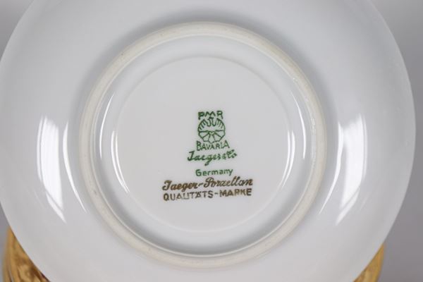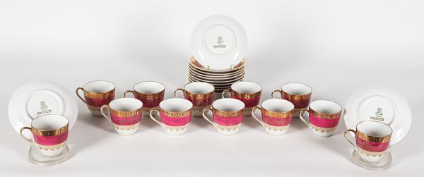 Lotto di dodici tazzine da caffè con piattini in porcellana tedesca di Bavaria, con decorazioni in rosso e oro zecchino