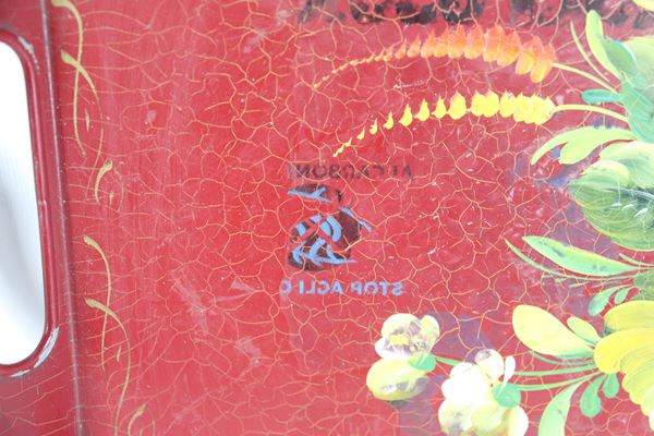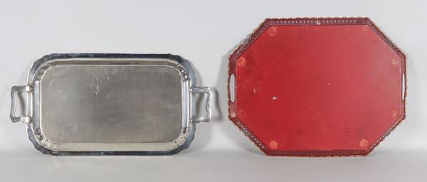 Lotto di due vassoi, uno in metallo argentato e uno laccato rosso con fiori dipinti