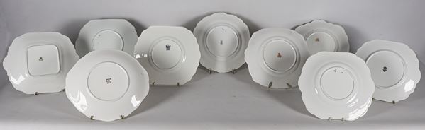 Lotto di nove piatti in porcellana con decorazioni policrome
