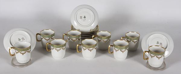 Lotto di nove tazzine da caffè con piattini in porcellana tedesca di Bavaria, con bordi in verde e oro zecchino