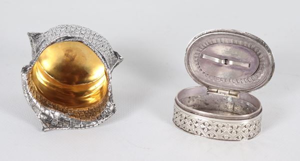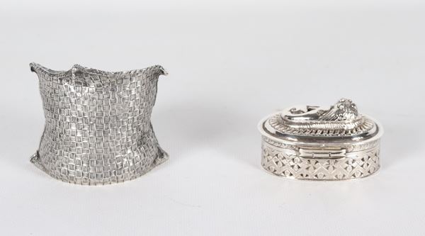 Lotto in argento cesellato e sbalzato Titolo 925: di un piccolo cestino a sacco con interno in vermeil firmato Buccellati e una scatolina ovale [..]