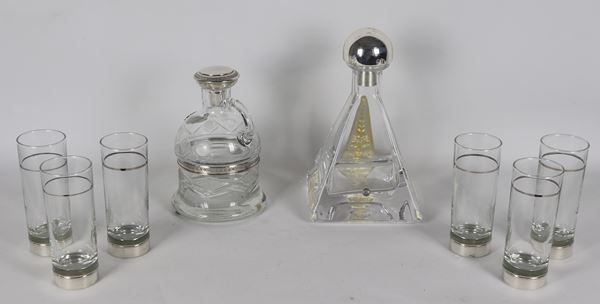 Lotto in cristallo con inserti in argento di due bottiglie e sei bicchieri (8 pz.)