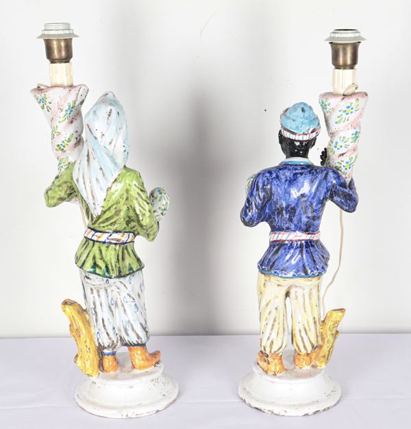 "Moretti", coppia di lampade in ceramica porcellanata, smaltata e policroma