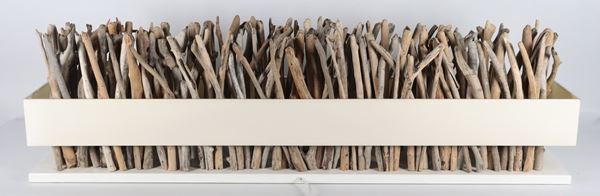 Originale grande lampada da tavolo in metallo bianco e rami in legno grezzo