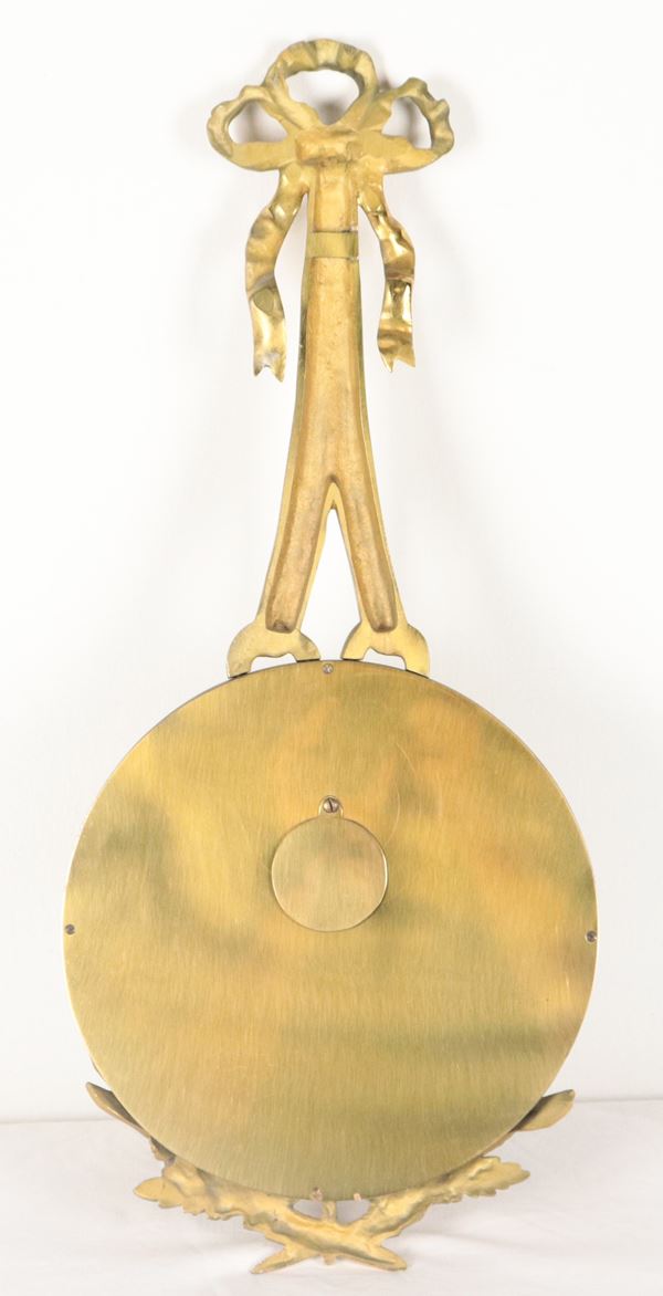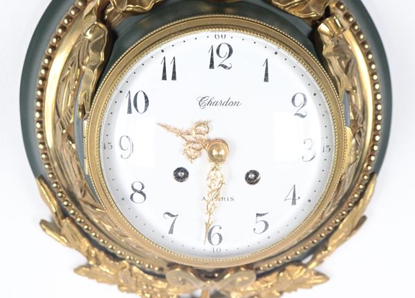 Orologio a cartel francese in bronzo dorato e cesellato a motivi Luigi XVI, quadrante in smalto bianco