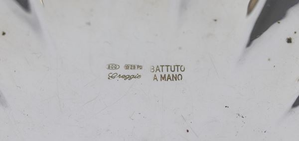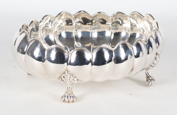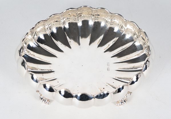 Piccolo centrotavola in argento con bordo frastagliato, sorretto da quattro piedini ricurvi, gr. 290