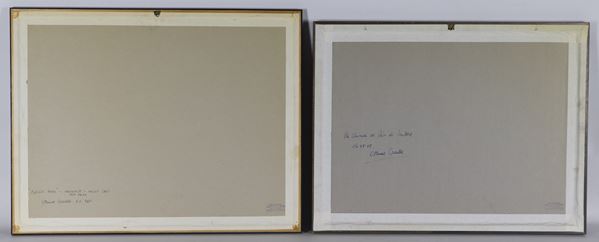 lotto di due acquarelli su cartamisure leggermente differenti, cornici argentate. Misura massima cm 32 x 45.