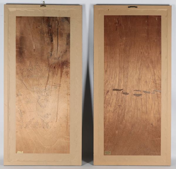 coppia di dipinti ad olio su tavolettacornici in legno ebanizzato e dorato, cm 91 x 42 ciascuno.