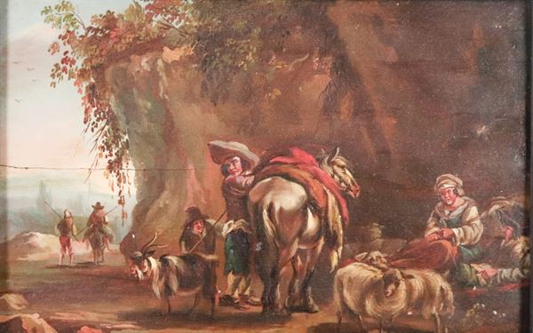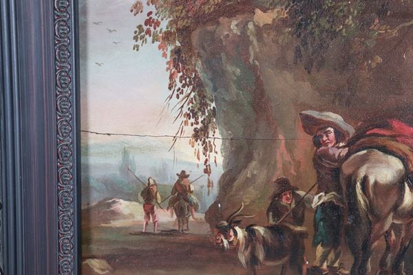 piccolo dipinto ad olio su tavola che presenta una piccola fessuracornice in legno di pero intagliato, cm 20 x 30.