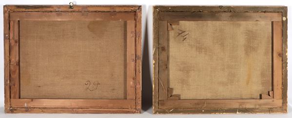 coppia di dipinti ad olio magro su carta applicata a telacornici in legno laccato, cm 50 x 65 ciascuno.