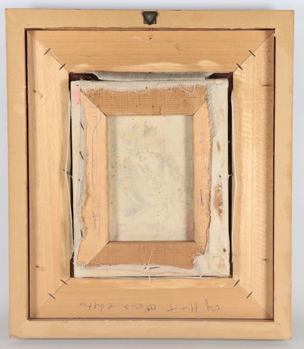 piccolo dipinto ad olio su telacornice in legno decorato, cm 25 x 20.