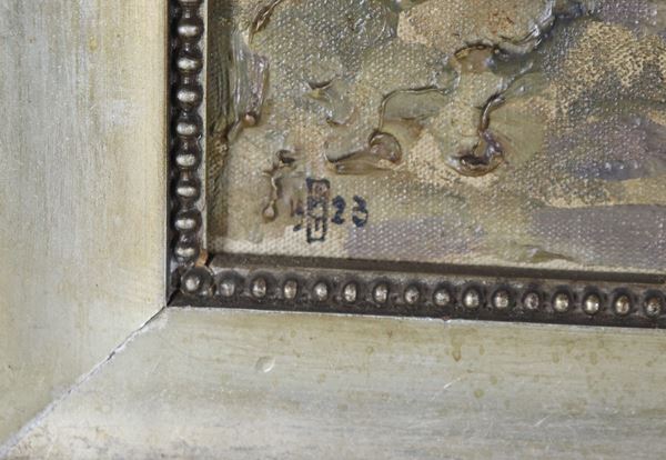 dipinto ad olio su telacornice in legno argentato, cm 30 x 40.