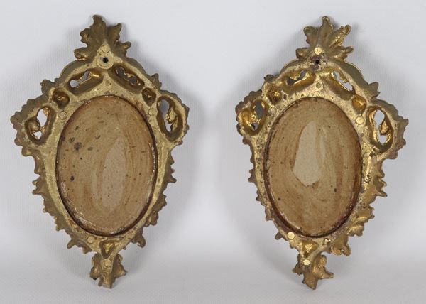 coppia di miniature ovali dipintecornici in legno dorato e intagliato, cm 12 x 18 h.