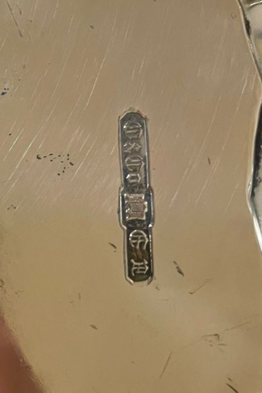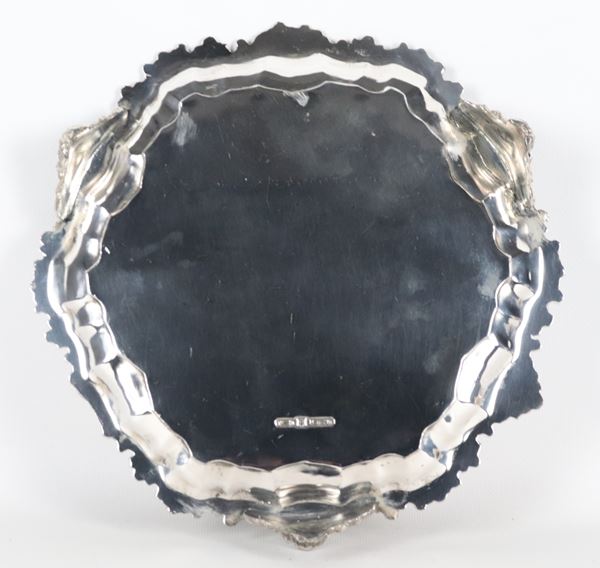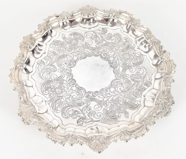 cesellato e sbalzato a volute floreali e sorretto da tre piedini ricurvi, diametro cm 27 x 4 h.