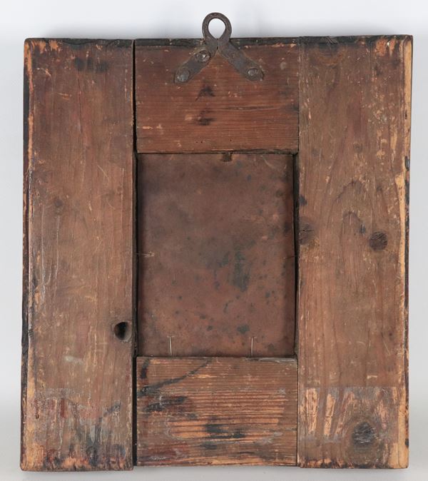 piccolo dipinto ad olio su rameantica cornice in legno ebanizzato e dorato, cm 18 x 15.