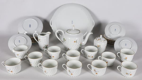 1 piatto da portata per dolce, 6 piattini da dolce, teiera, lattiera, zuccheriera, 12 tazze e 8 piattini.