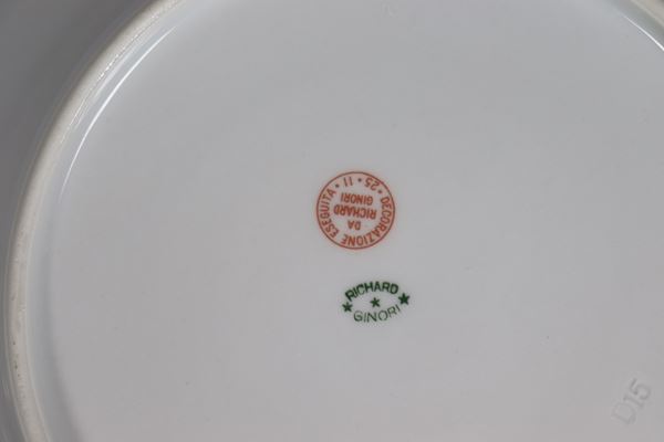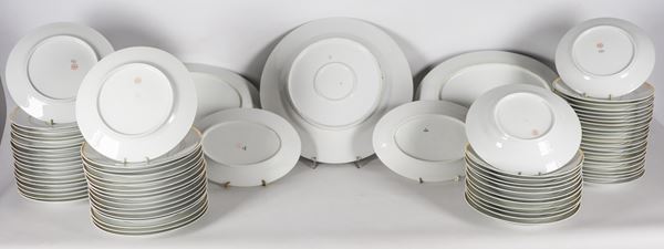 12 fondine di cui una con lieve sbeccatura al bordo, 36 piatti piani, 22 piatti piccoli, 4 piatti ovali da portata di cui due grandi e due piccoli e 1 piatto tondo da portata.