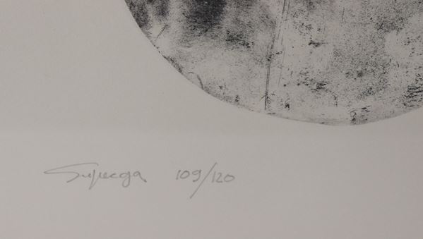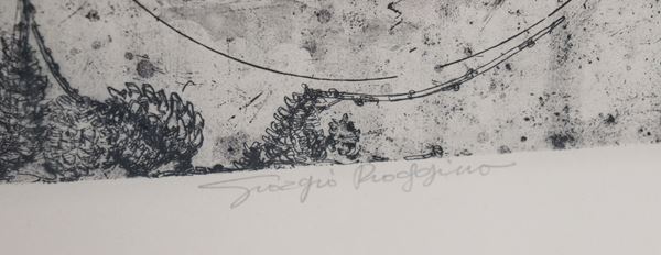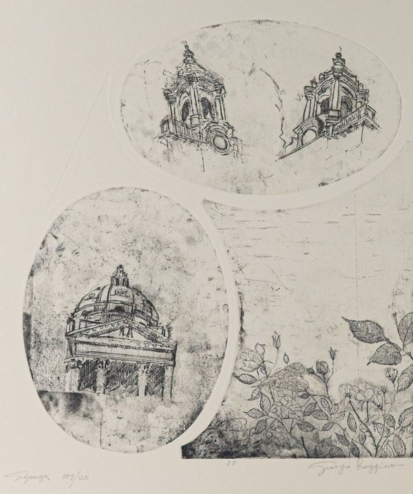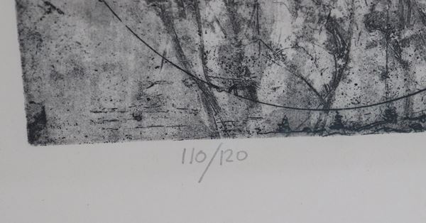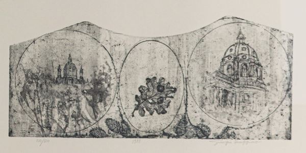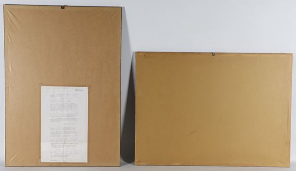 lotto di due acqueforti su carta cornicette in legno e passepartout. Misura massima cm 48 x 68.