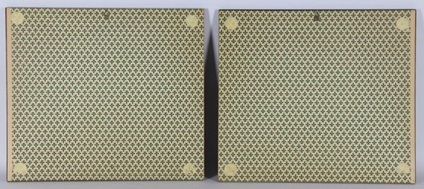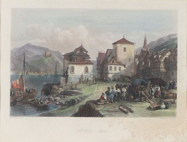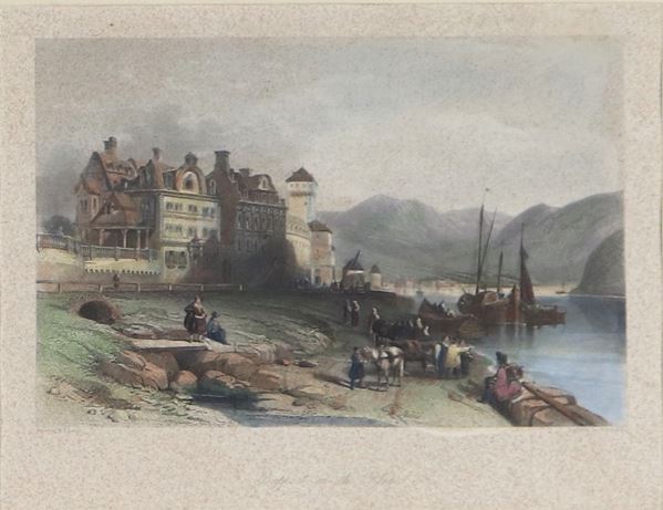 coppia di antiche piccole stampe a coloricornici in noce e passepartout, cm 16 x 21 ciascuna.