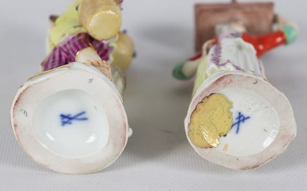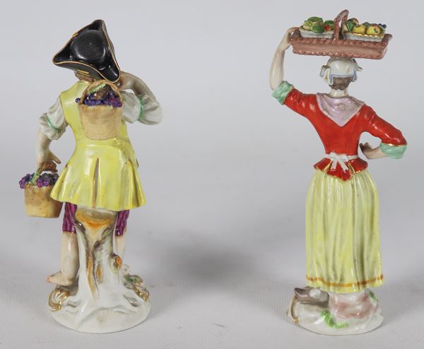 "Venditori di frutta", coppia di antiche piccole statuine in porcellana policroma Meissen