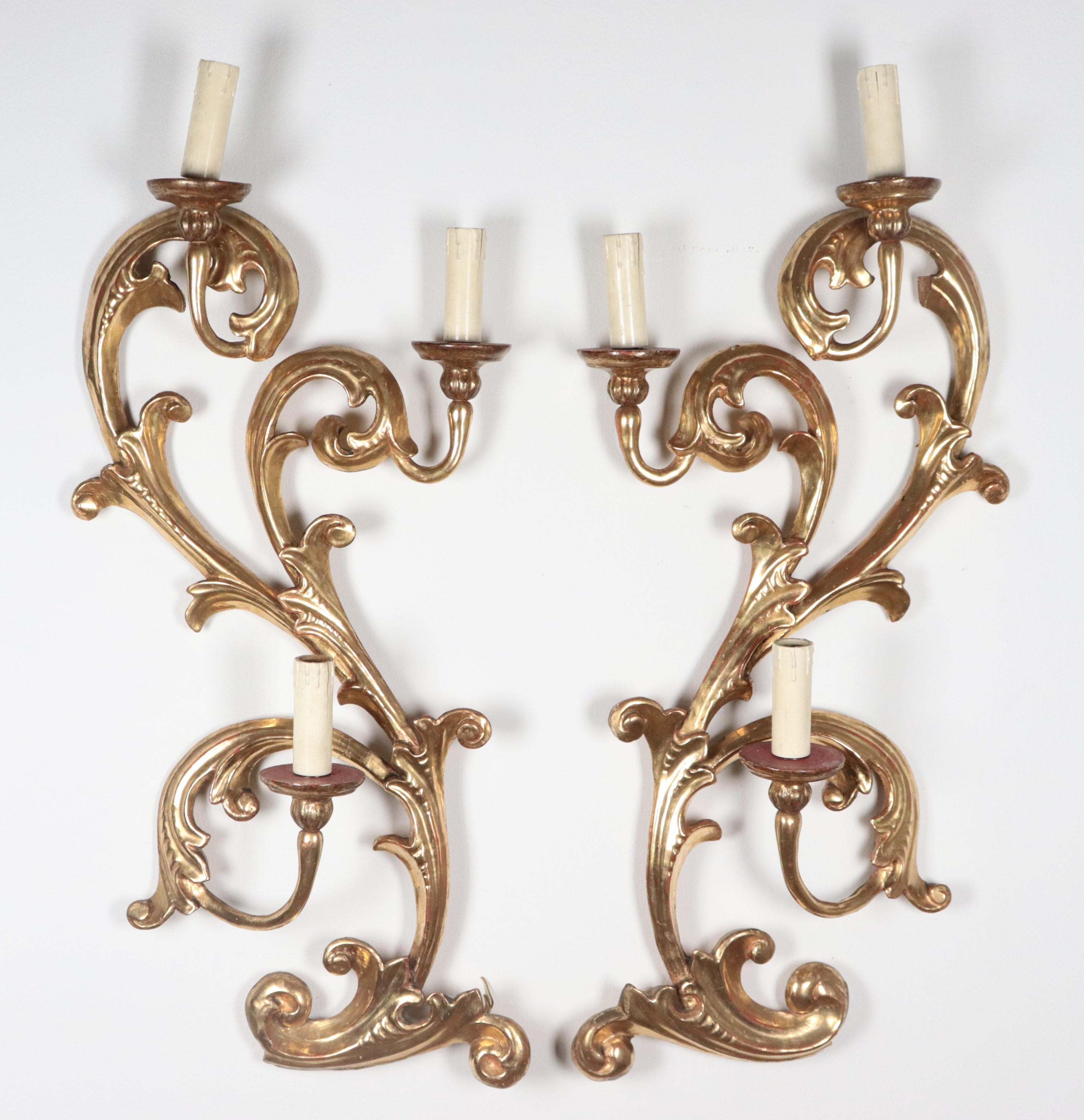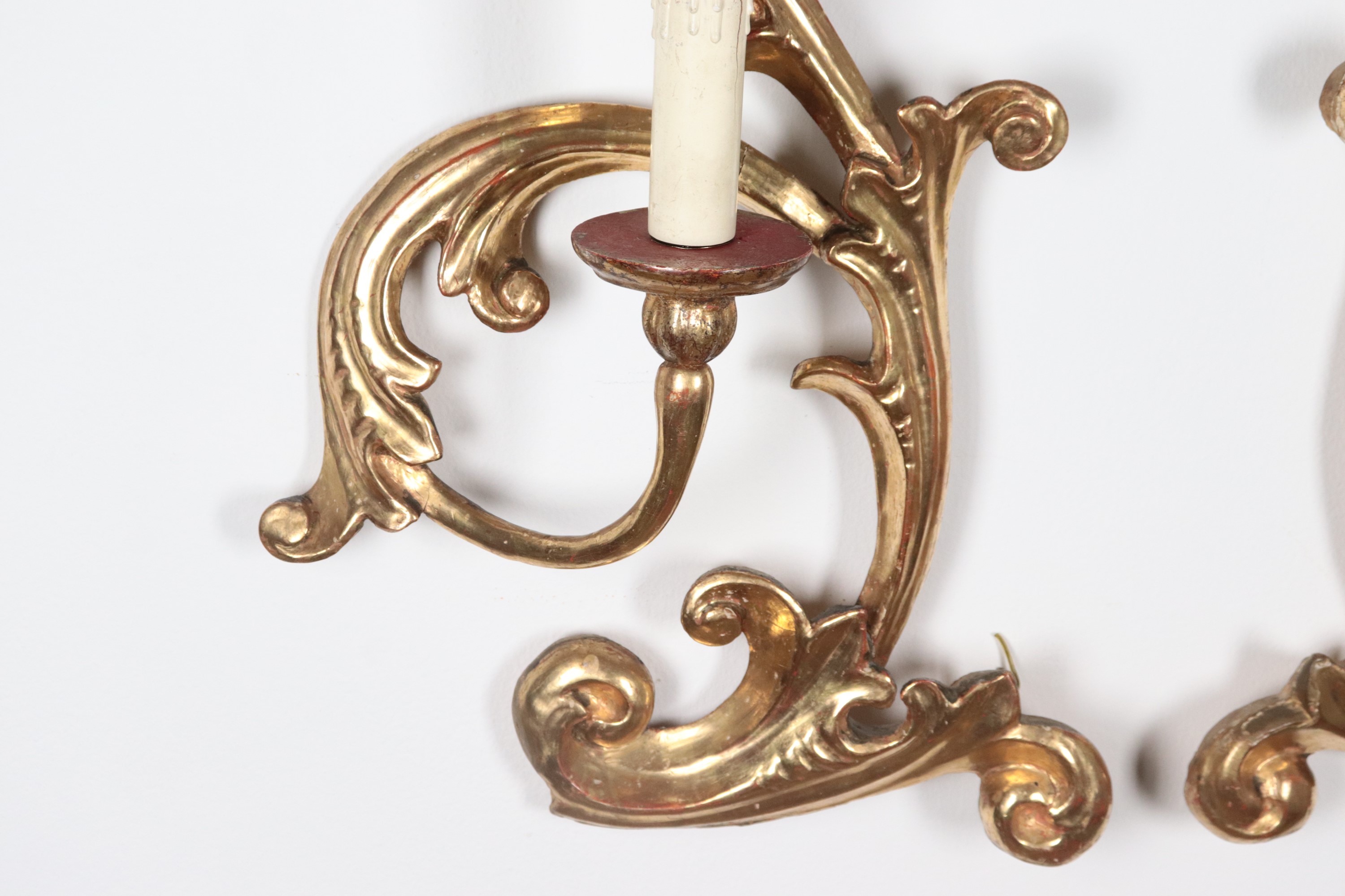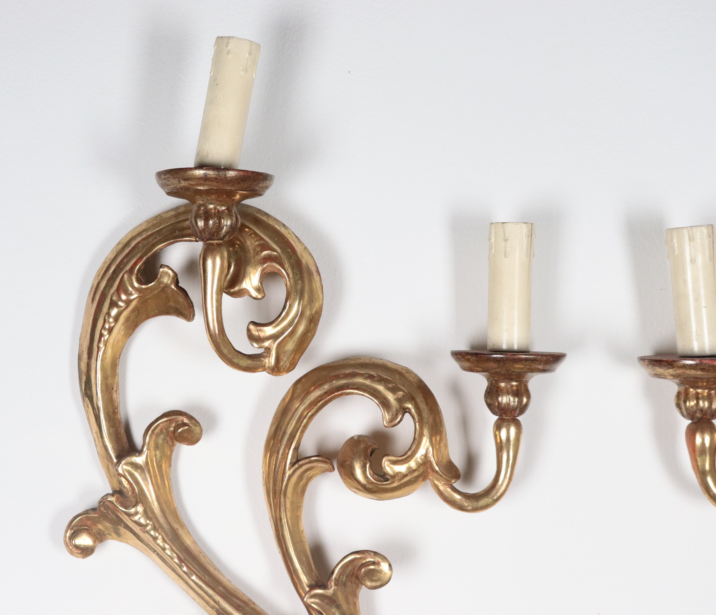 Coppia di appliques in legno dorato e intagliato a motivi Luigi XV, 3 luci ciascuna