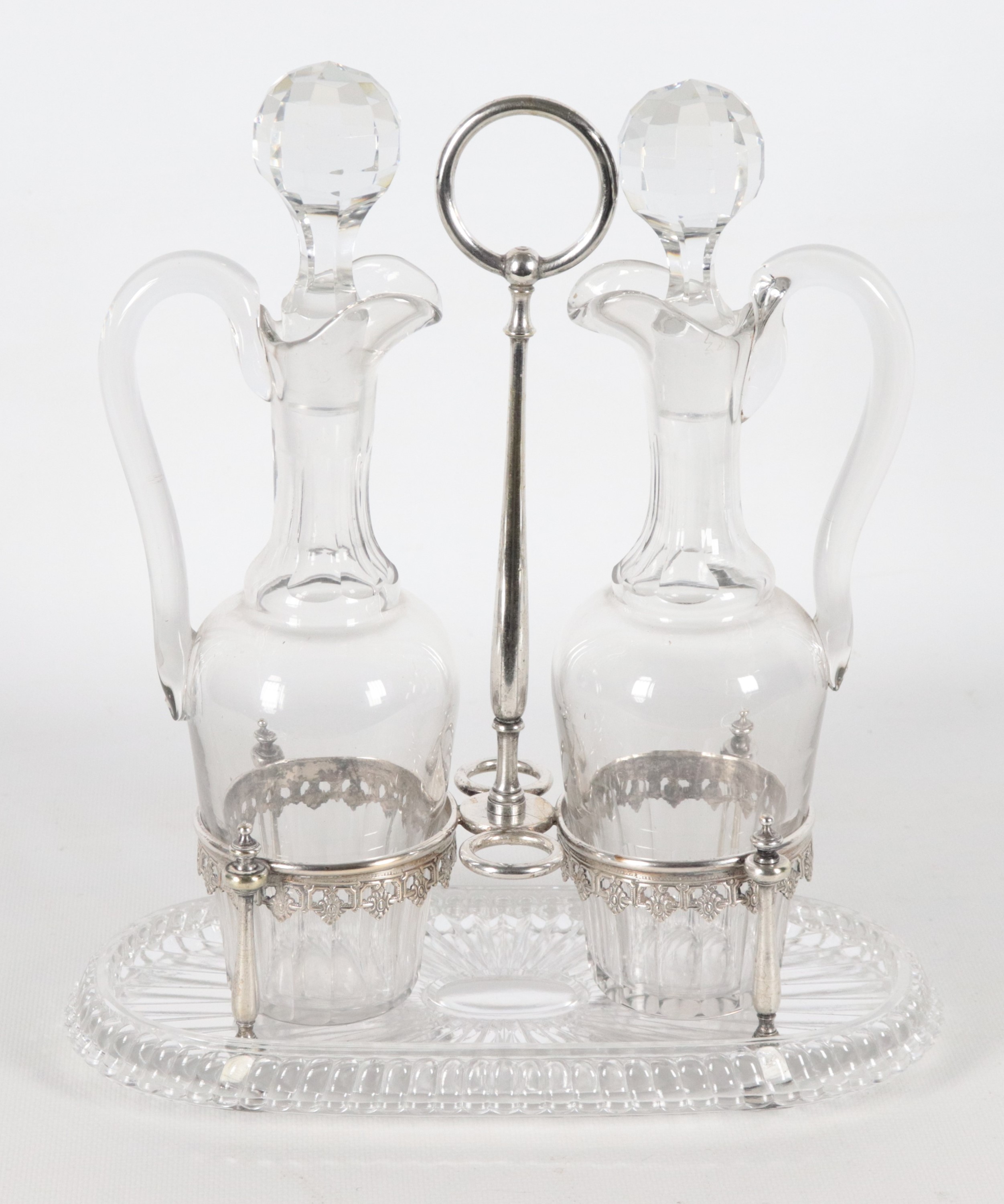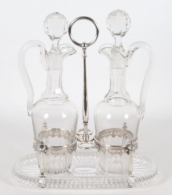 Oliera di linea Impero in cristallo e metallo argentato, due ampolle