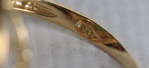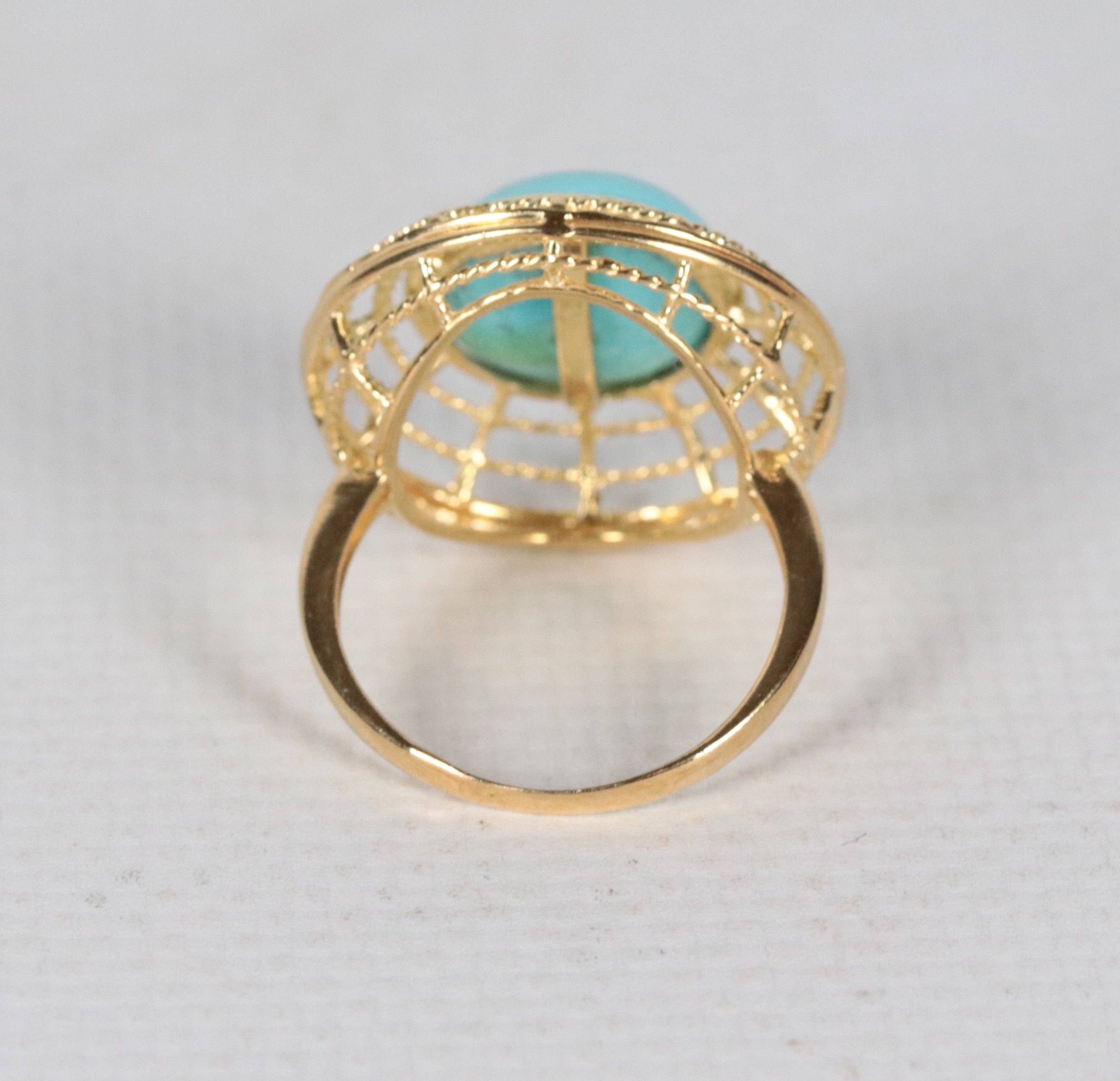 Anello in oro giallo 18kt, con lavorazione traforata e pasta di turchese centrale. Peso lordo gr. 5,5