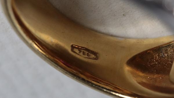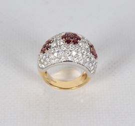 Anello in oro giallo e bianco 18kt, con pavè di piccoli diamanti taglio brillante ct 3,40 circa e piccoli rubini. Peso lordo gr. 18