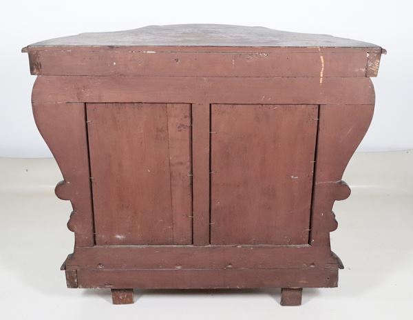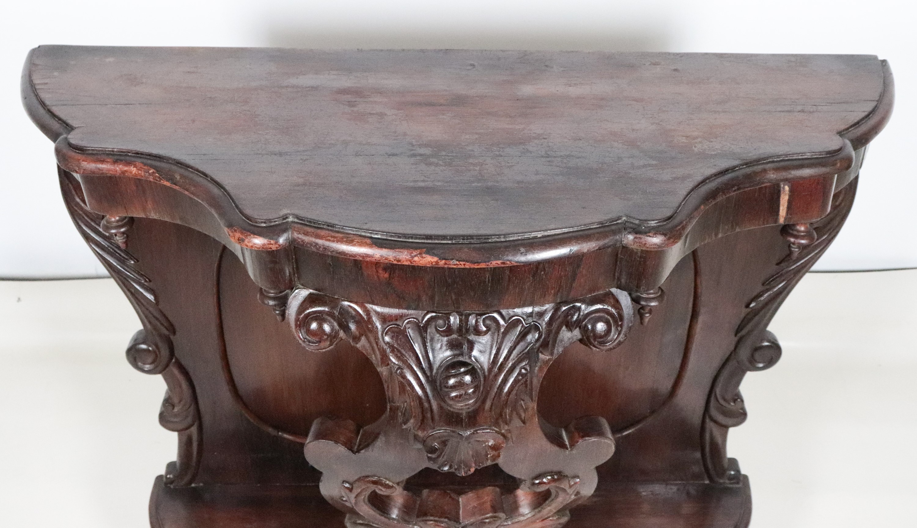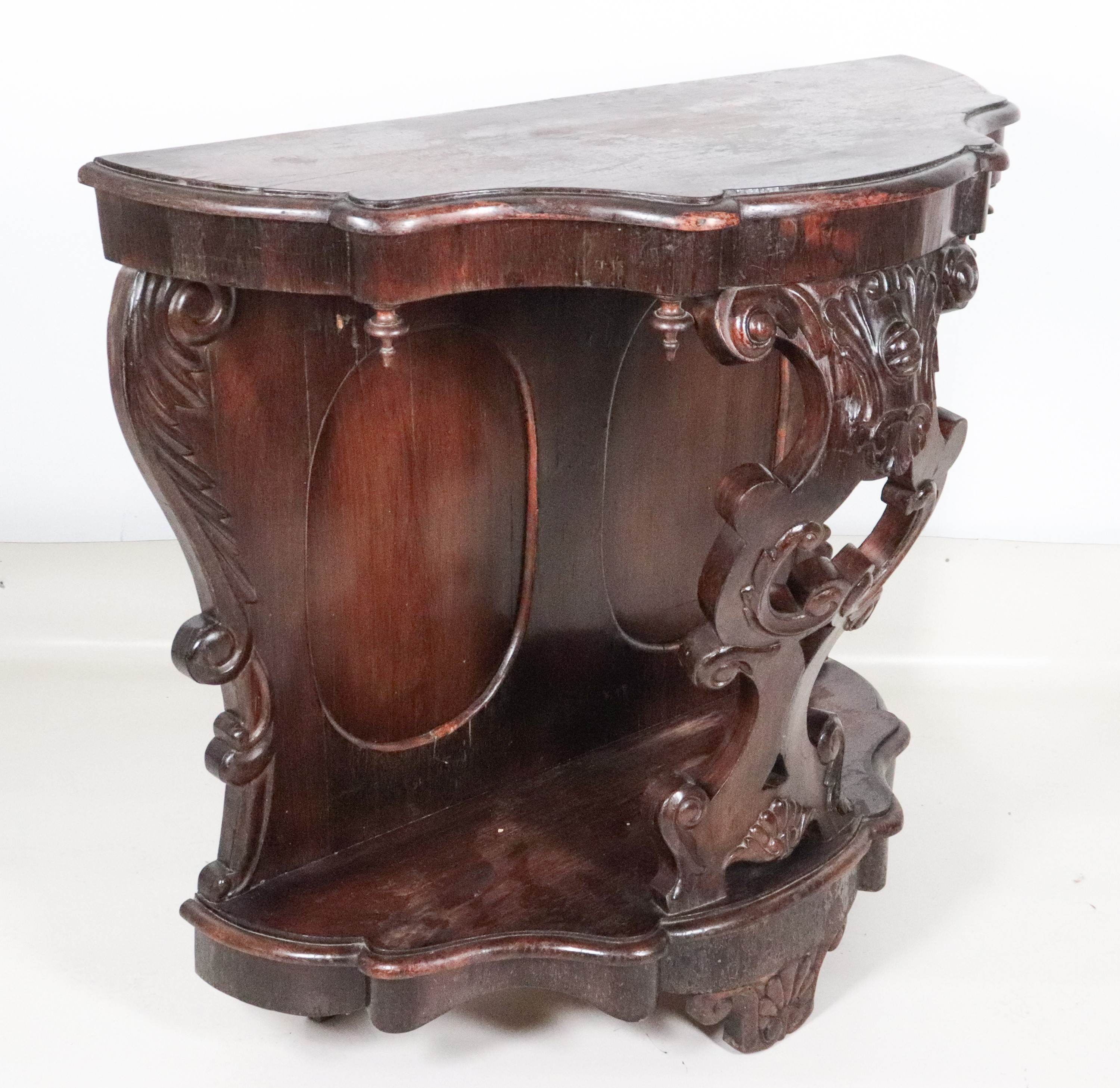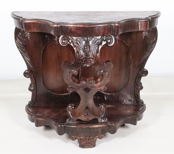 Antica consolle napoletana Luigi Filippo in noce, con piano centinato e sostegno centrale intagliato e traforato a volute
