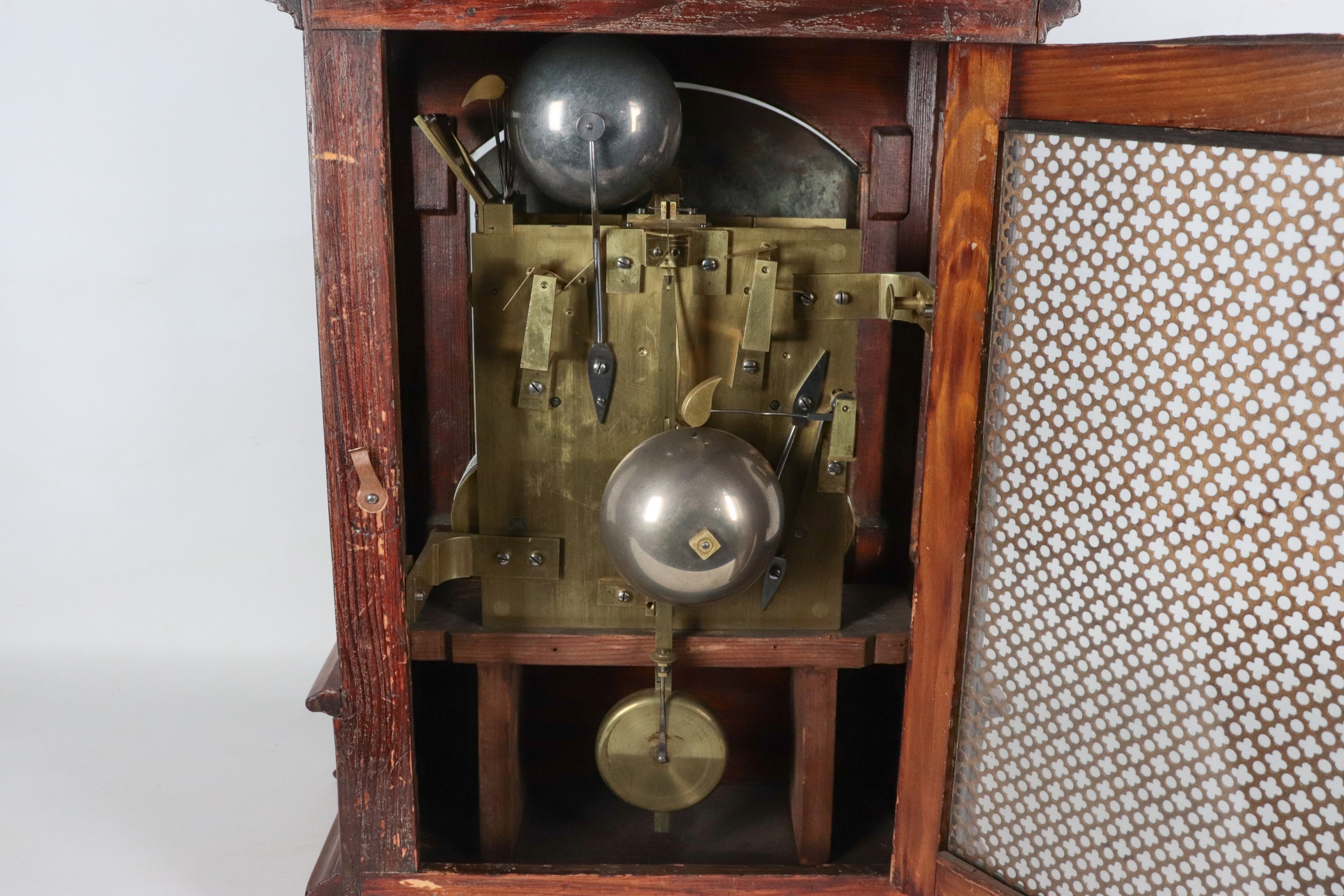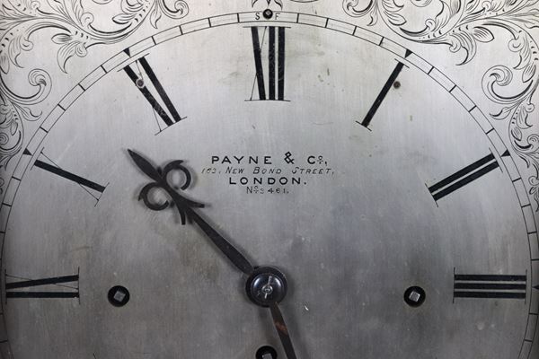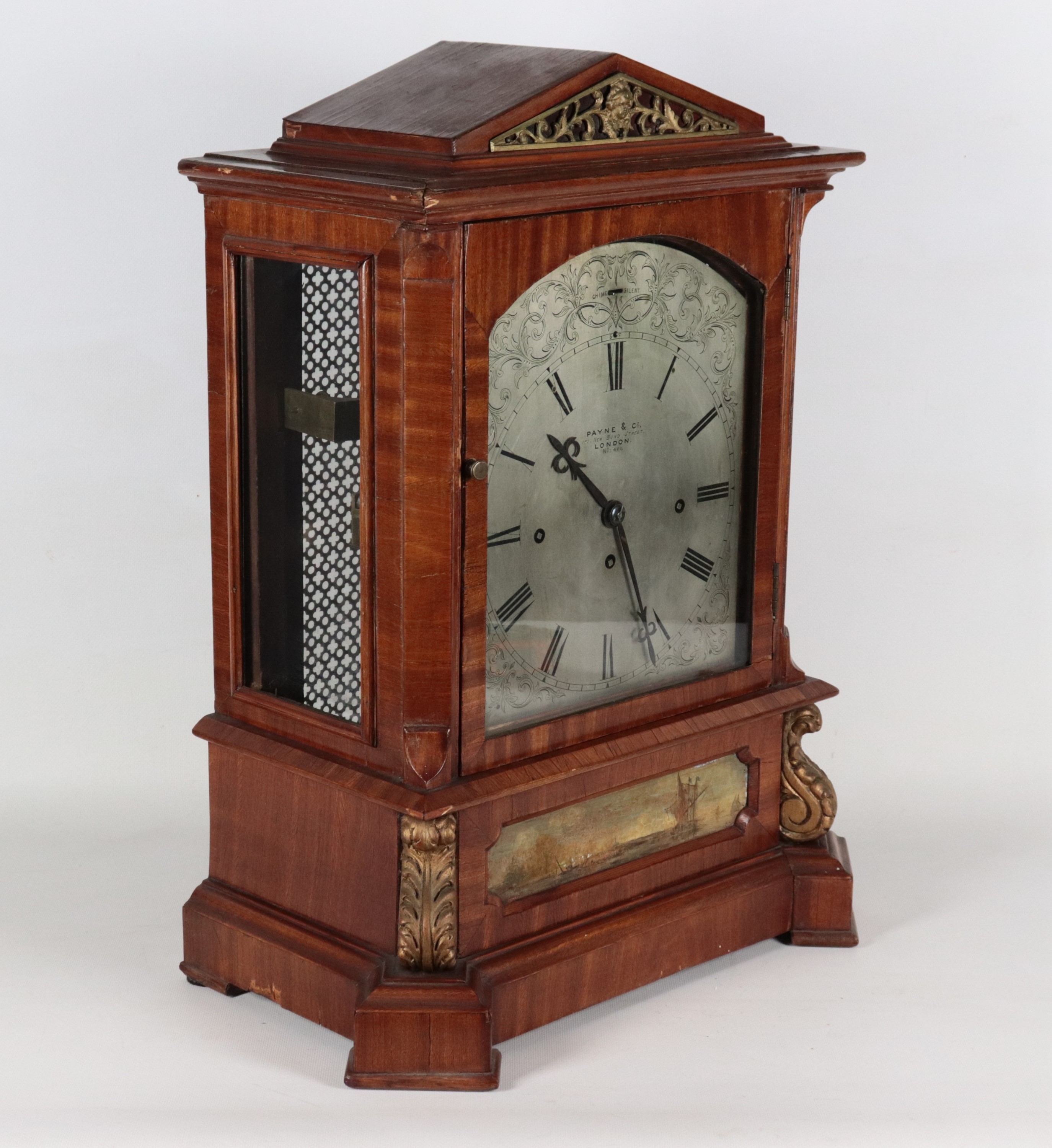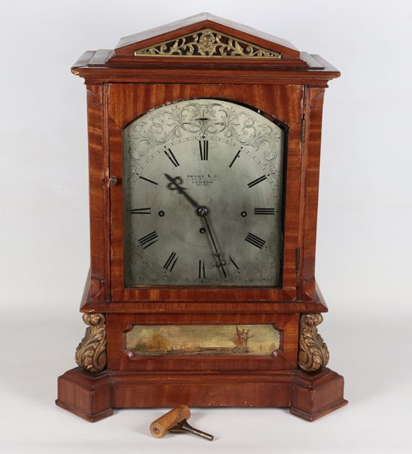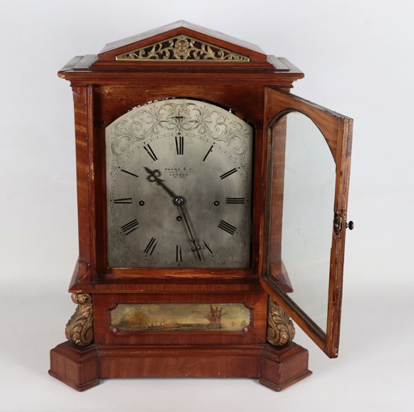 Antica pendola da tavolo a tempietto in mogano, quadrante con cifre romane firmato Payne & Co (1811-1875), nella parte sottostante decorazione [..]