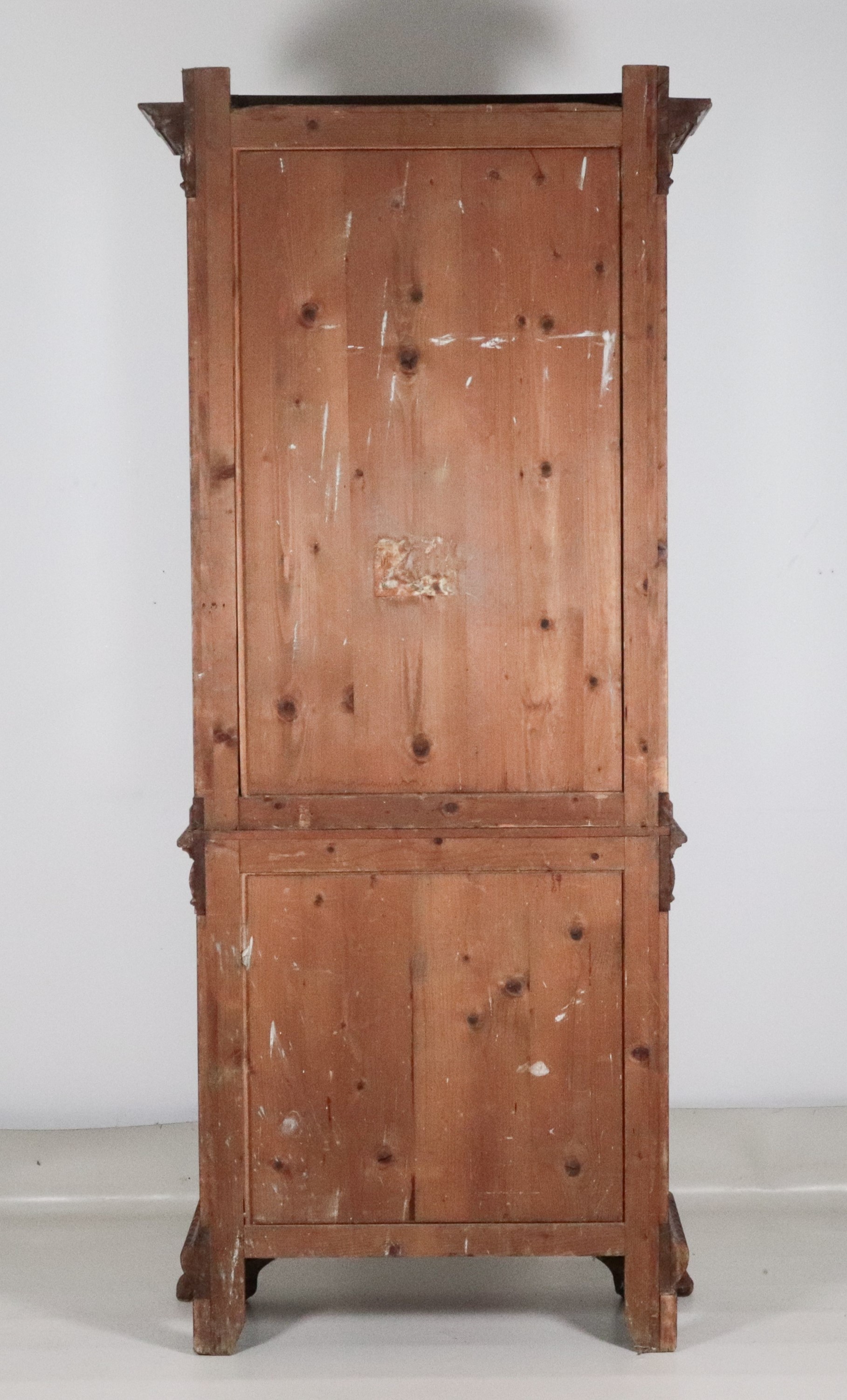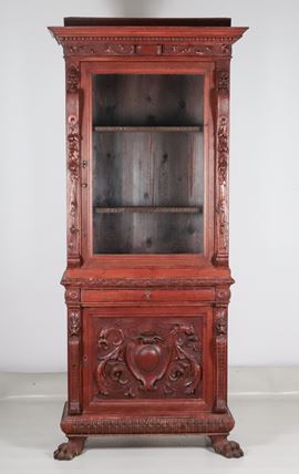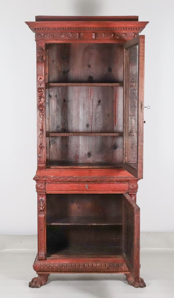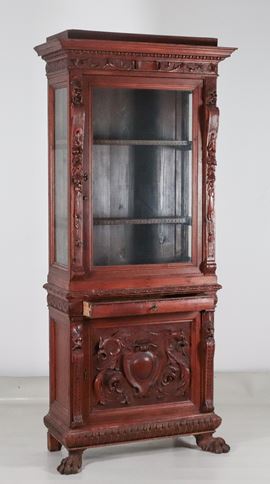 Antica vetrina di linea Rinascimento in noce, con intagli a motivi di draghi, mascheroni ed intrecci di fiori e frutta, gambe a zampa di leon [..]