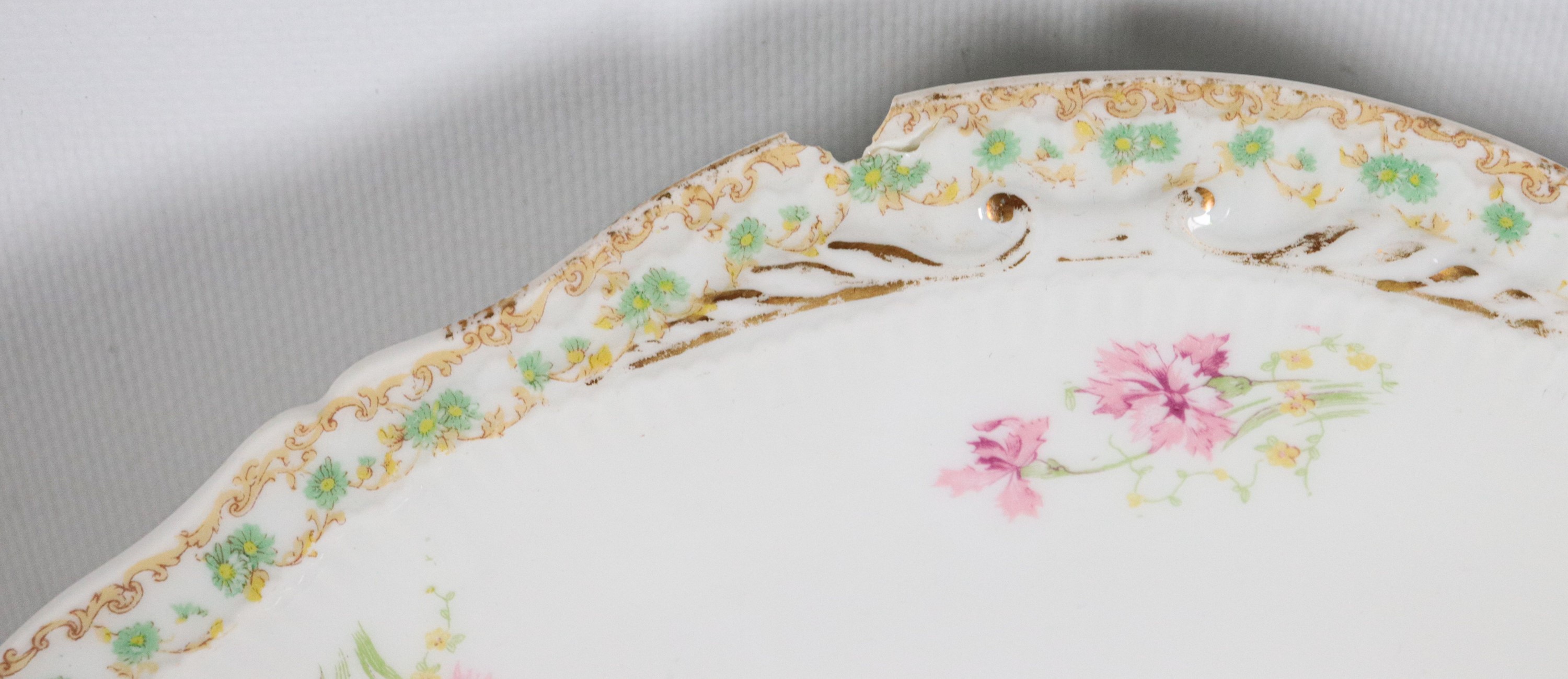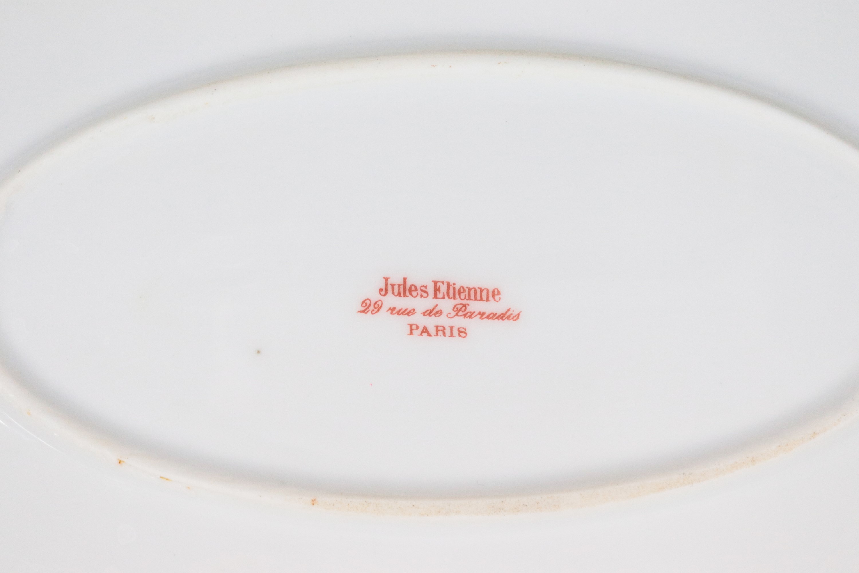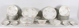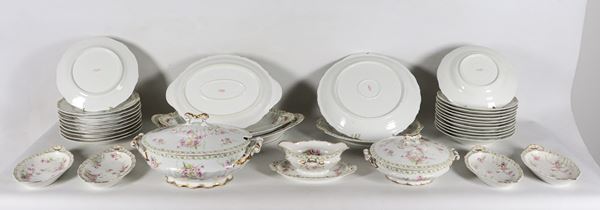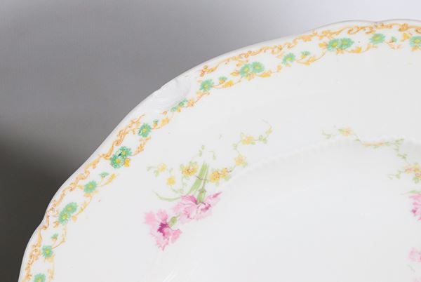 Antico servizio di piatti in porcellana francese, con decorazioni policrome a motivi di mazzetti di fiori (77 pz). Marcato Jules Etienne, 29 [..]