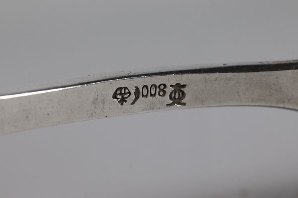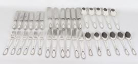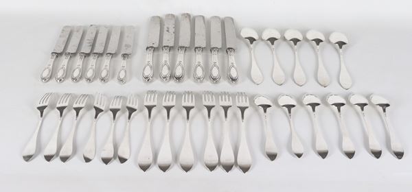 composto da: 5 cucchiai grandi, 6 forchette grandi, 6 coltelli grandi, 6 cucchiai da dessert, 6 forchette da dessert e 6 coltelli da dessert. Le lame dei coltelli sono usurate.