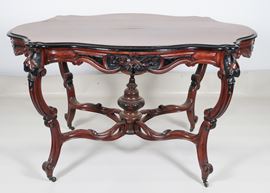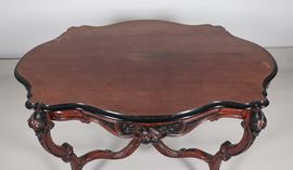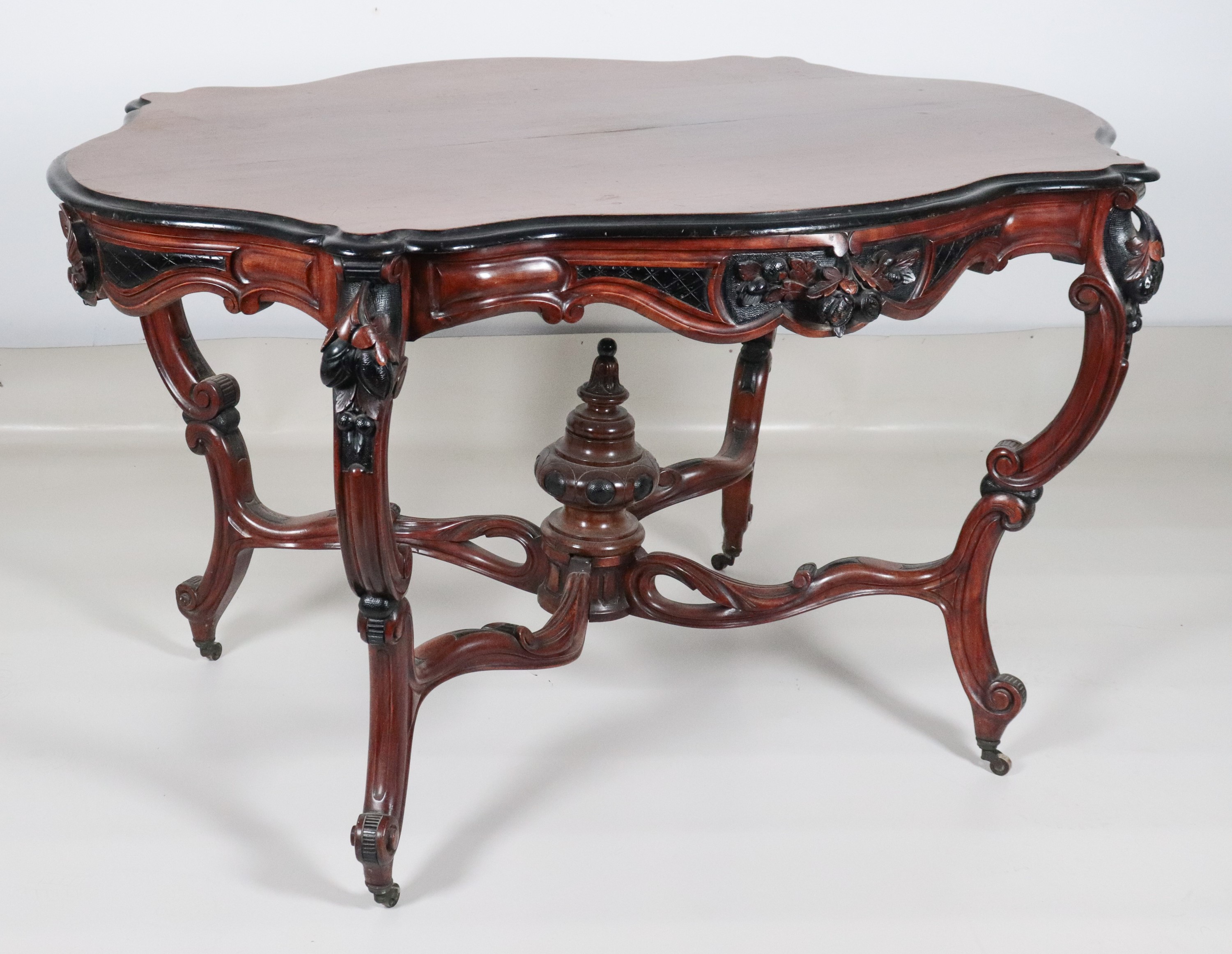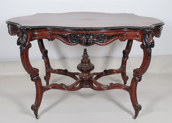 Antico tavolo a rognon Luigi Filippo in noce, con piano ovale sagomato ed intagli ebanizzati a motivi di calatine di frutta