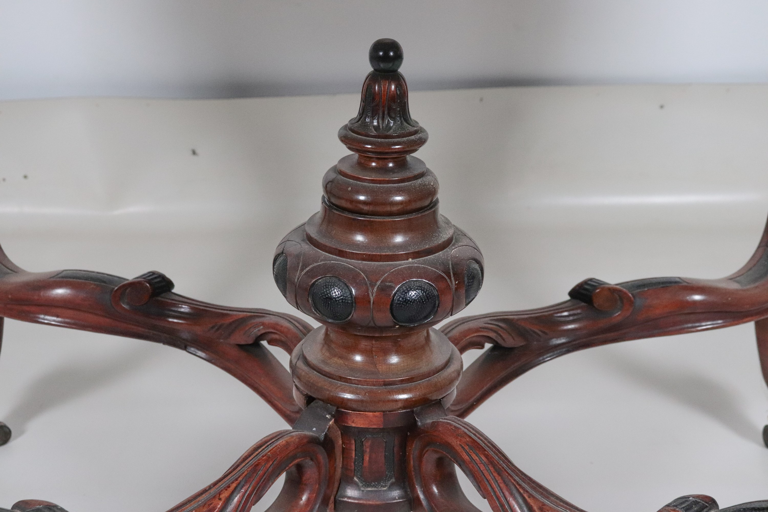 quattro gambe ricurve, riunite da crociera sagomata sormontata da pinnacolo, cm 130 x 89 x 78 h.