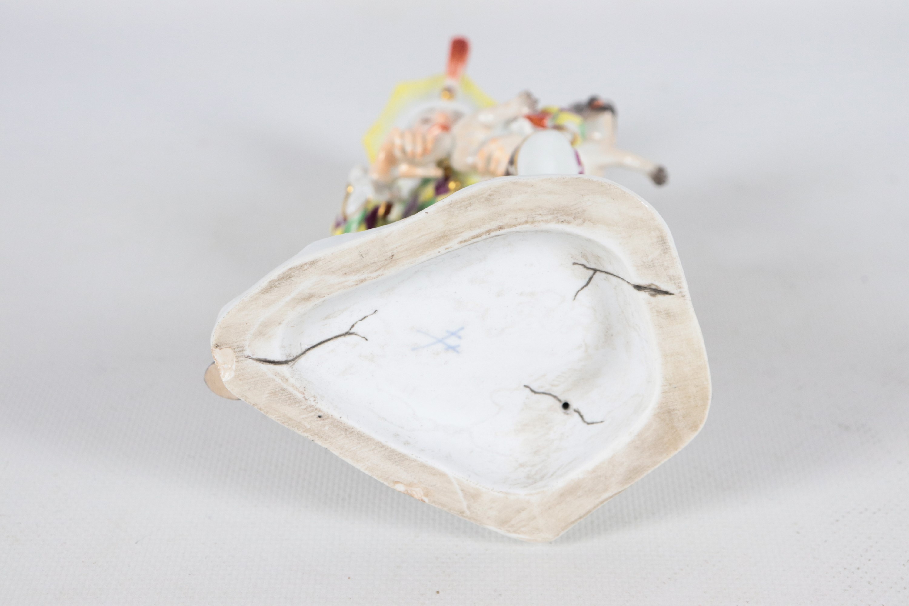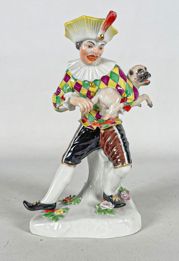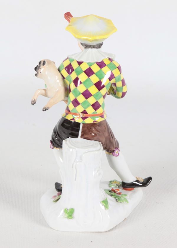 "Arlecchino con cagnolino", antica piccola scultura in porcellana policroma Meissen