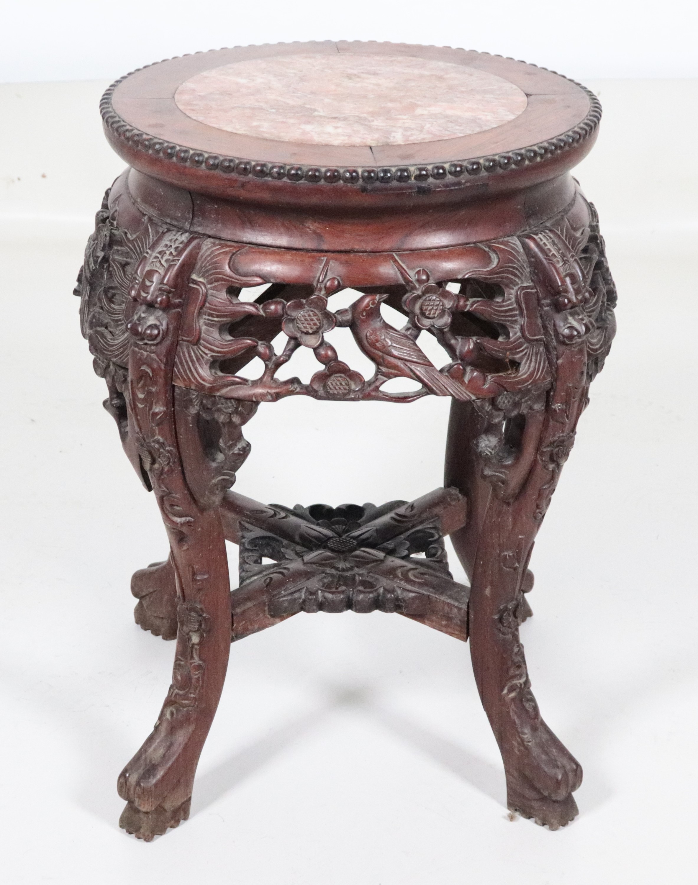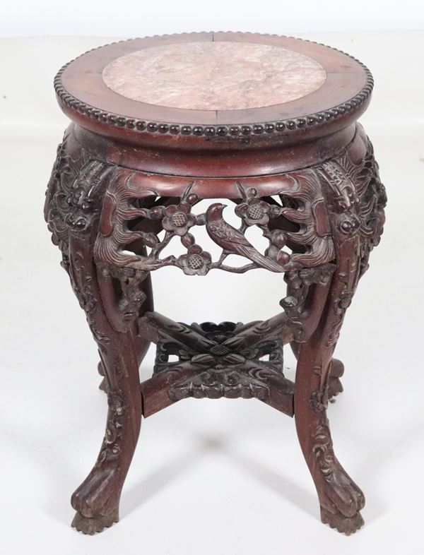 Base cinese in legno di teak intagliato a motivi di fiori e uccelli esotici
