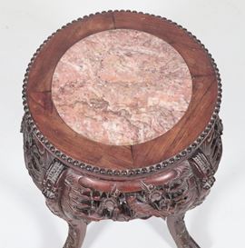 quattro gambe ricurve riunite da crociera e piano con marmo incassato, diametro cm 35 x 46 h.
